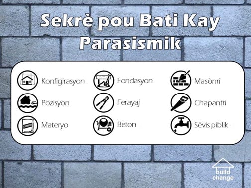 Build Change Publication in Kreyol with clear illustrations for do’s and don’ts using confine masonry construction.